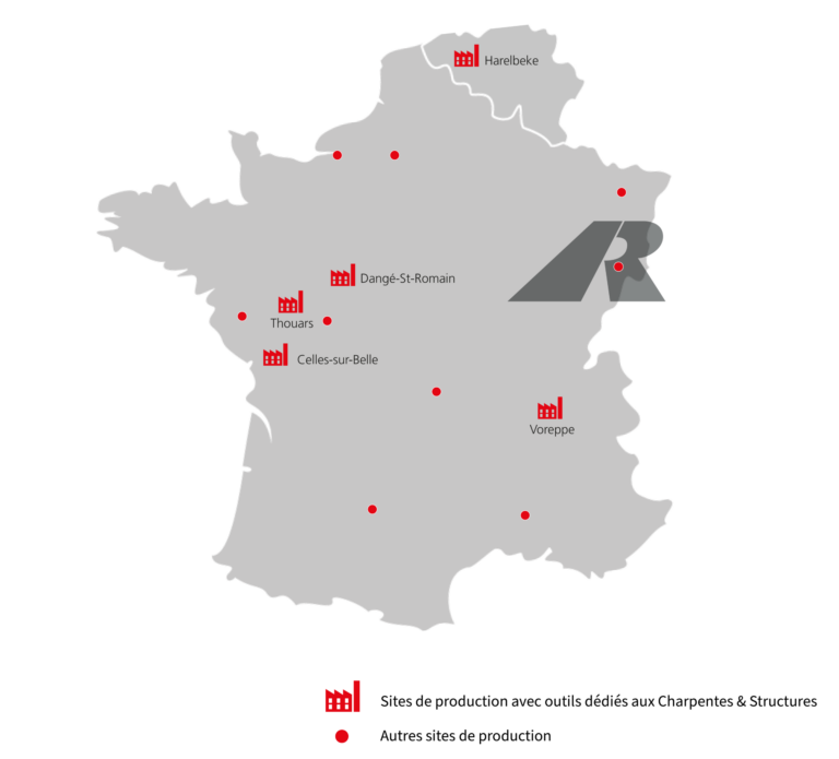 Grâce au maillage de nos usines en France et en Belgique, nous sommes en capacité de fournir des charpentes et structures complètes sur l’ensemble du territoire.